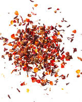 Apple bits, hibiscus, rosehip peels, citrus peels, safflower petals.